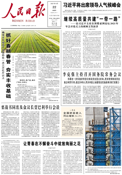 今天《人民日报》的主要内容有: 1、确保全年粮食产量保持在一点三万亿斤以上,抓好春耕春管,夯实丰收基础。 2、国常会:部署进一步实施好常态化财政资金直达机制,更好发挥财政资金惠企利民作用。 3、一季度全国财政收入同比增长24.2%。 4、全国新冠疫苗接种超2亿剂次,确保第二剂次接种在8周内完成。 5、中国气象局发布工作方案,到二〇二五年气象科研人员数量翻番。 6、我国网络生态治理将重点强化专项整治和基础管理。 7、全国进口冷链食品追溯管理平台已初步建成上线。 8、河北开展中药生产专项检查。 9、宁夏推进人工智能辅助诊断体系建设。