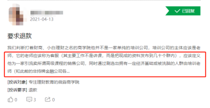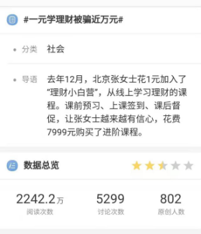 前不久,#1元学理财被骗近万元# 登上微博热搜,财商教培的骗局再次浮出水面。张女士花1元加入了“理财小白营”,开始进行线上理财课程的学习,一开始课前预习、课上签到、课后督促的学习体验,让张女士越来越信任机构,进而又购买了7999元的进阶课程,但张女士发现进阶课程比理财小白营差远了。但意识到上当受骗的“张女士们”再想退款却频频遭遇闭门羹。