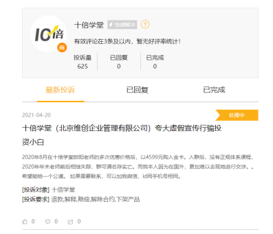 张女士并非个例,黑猫投诉平台显示,财商培训已经成为黑榜的重点名单。4月21日的黑榜月榜列表中,十倍学堂位列第7位,从去年11底开始,不到半年时间,十倍学堂累计投诉量达625条。