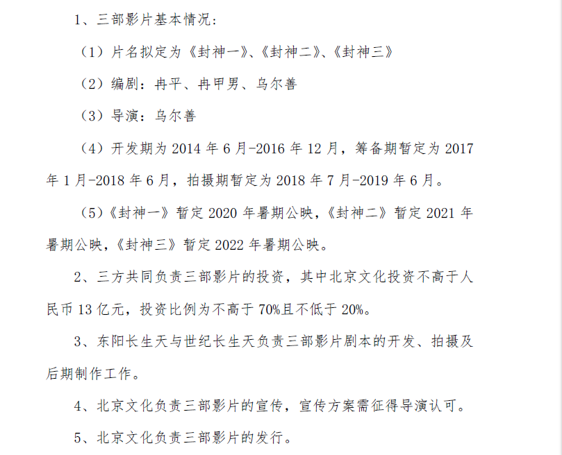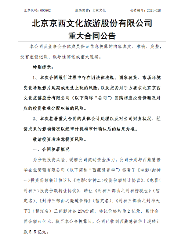 4月21日,北京文化发布《重大合同公告》,公告称,为了缓解公司流动资金压力,北京文化与西藏慧普华签署了三份份额转让协议,转让《封神三部曲之封神榜现世》(暂定名)、《封神三部曲之魔道争锋》(暂定名)、《封神三部曲之封神天下》三部影片各25%份额,转让价格均为2亿元,累计合同金额6亿元。截至公告披露日,北京文化已收到西藏慧普华上述转让款5.5亿元。