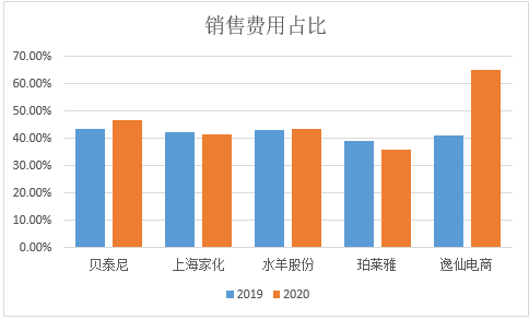 事实上,化妆品的非必需品的属性就决定了化妆品企业的销售费用占比普遍偏高。例如,老牌国产护肤品龙头上海家化(600315.SH)2019年的销售费用占比已经达到42.2%。同样是注重线上营销的面膜龙头水羊股份(300740.SZ)的销售费用占比达到43.2%,均超过逸仙电商。还有贝泰尼(300957.SZ)、珀莱雅(603605.SH)等护肤品企业2019年的销售费用占比也在40%左右。可见,注重销售费用投入的策略在化妆品企业中并不鲜见。
