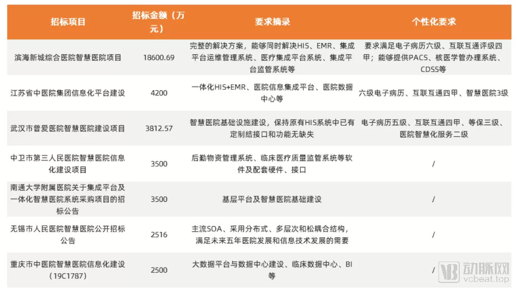 上述38个标的之中,58%的标的位于1000万元内这一区间,从招标文件来看,这一部分标的主要聚焦于单一HIS购置或集成平台搭建;39%的标的位于1000万元-1亿这一区间,其中又以1000-2000万居多,这一部分在购置HIS的同时,通常会伴随电子病历评级、互联互通评级、智慧医院评级、大数据中心建设。