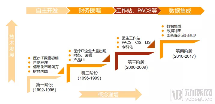 医疗IT发展的四个阶段同样是医院管理信息系统变化的四个阶段,其定义处于不断变化之中,通常可参照以下定义: