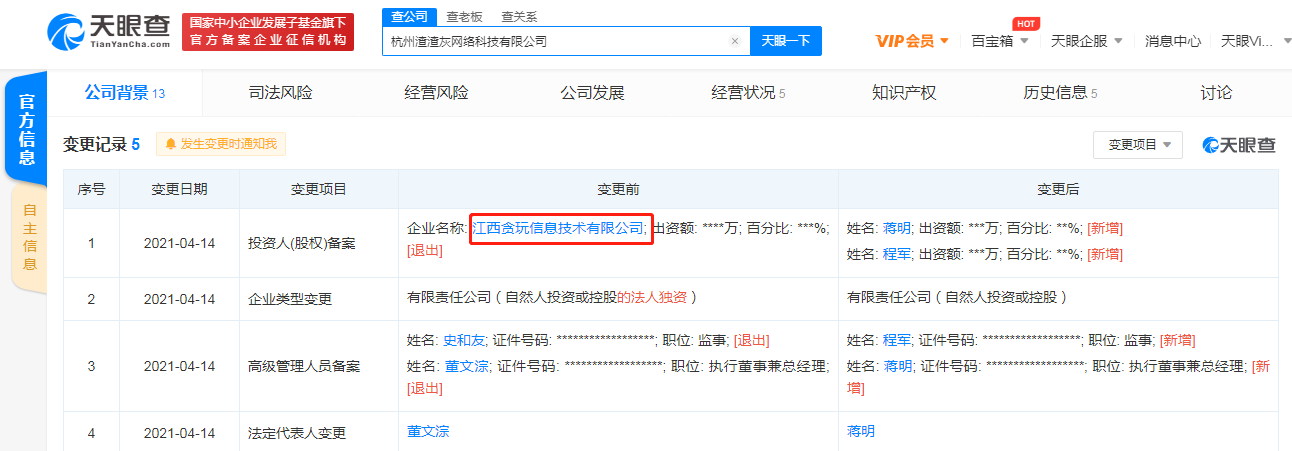 据天眼查APP显示,4月14日,杭州渣渣灰网络科技有限公司发生多项工商变更,原股东江西贪玩信息技术有限公司(贪玩蓝月关联公司)退出,新增股东蒋明、程军。同时法定代表人由董文淙变更为蒋明。
