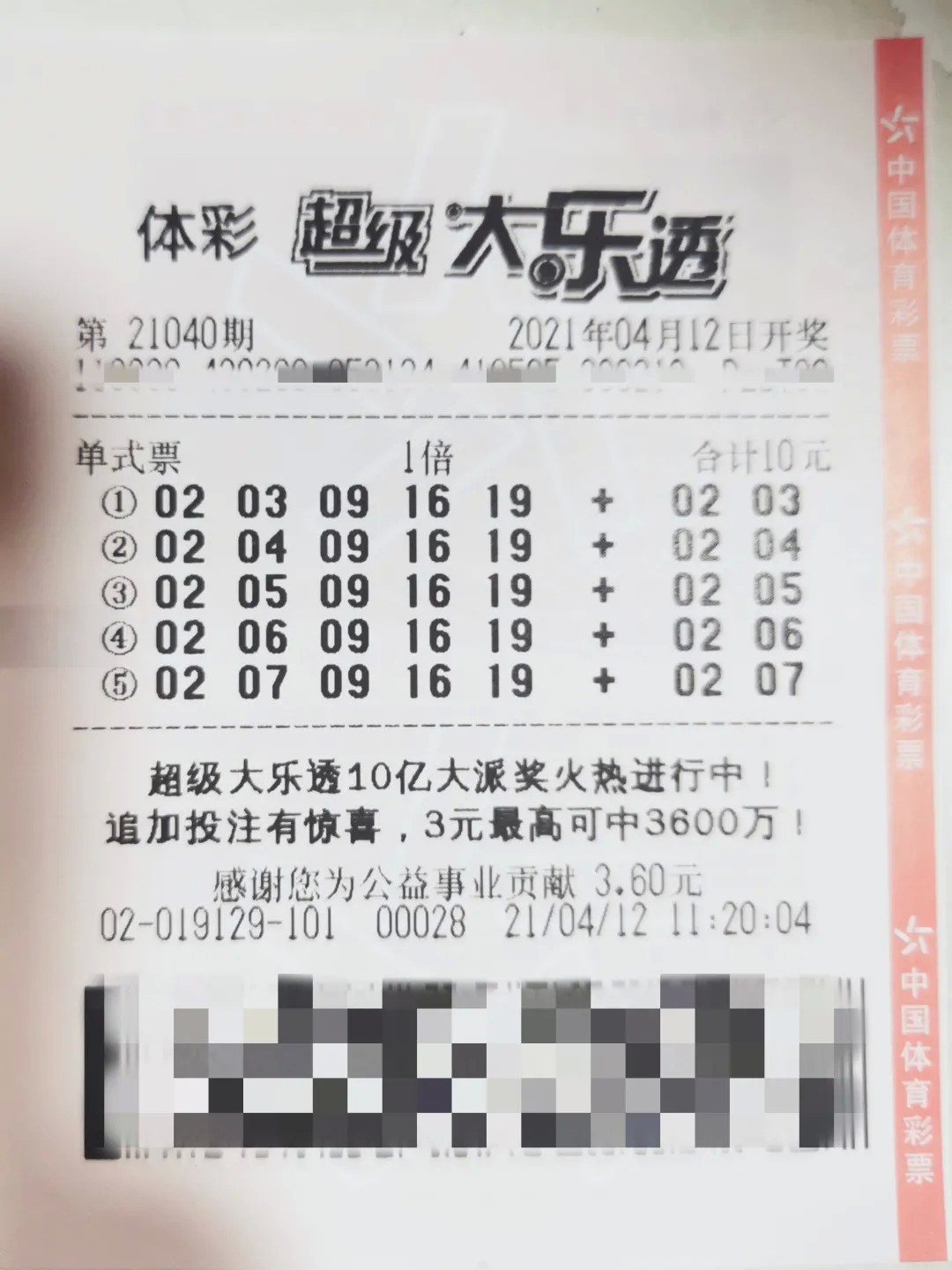 4月12日晚,体彩大乐透第21040期开出奖号“02 03 09 16 19,03 07”。位于宁波市海曙区高桥镇水岸花园柳鸣路109号的3302019129体彩实体店中出当期二等奖1注,单票总奖金100492元。