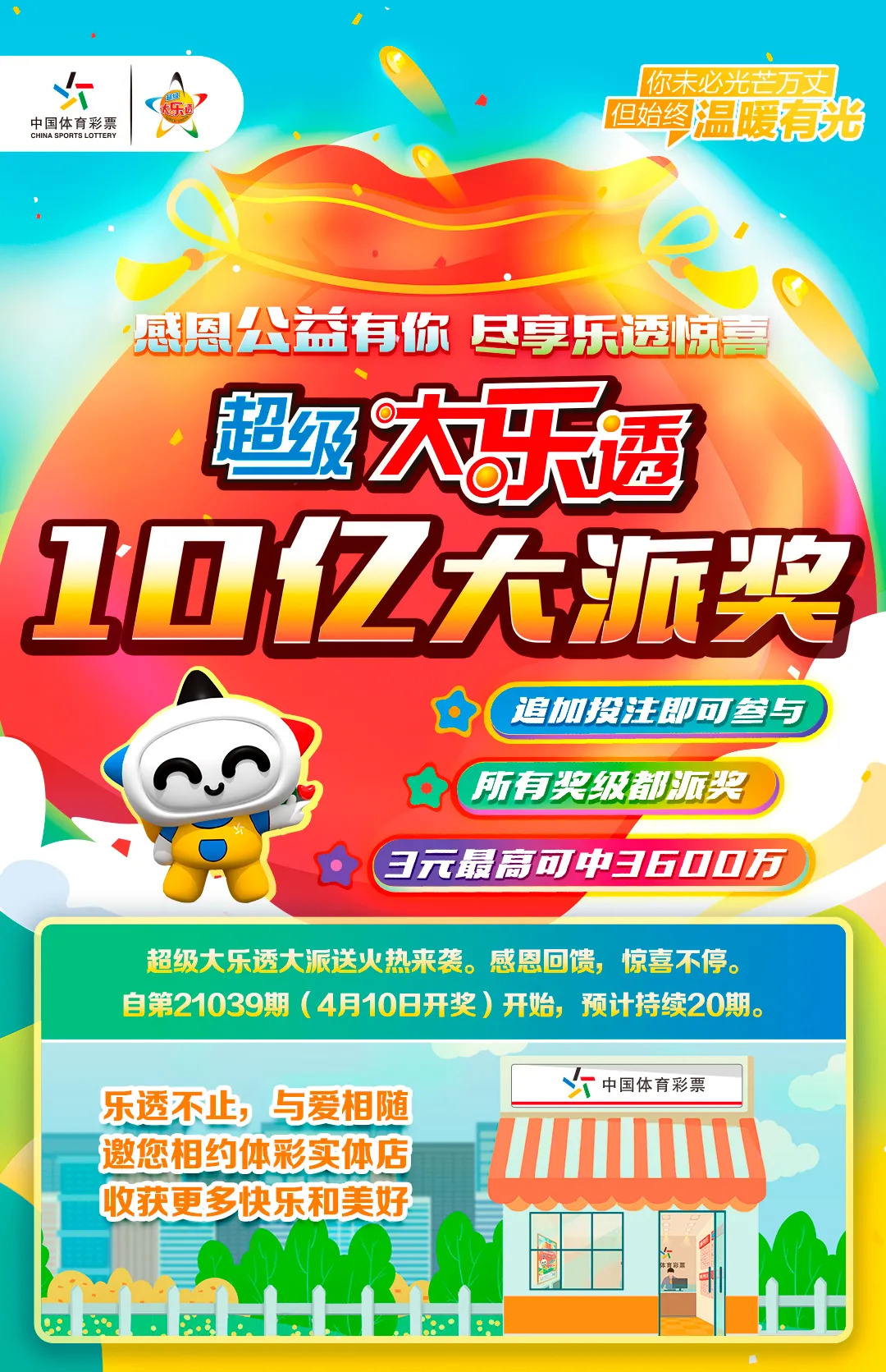 派奖期间,追加投注后,单注最高奖金可达3600万元。赶快趁大乐透10亿大派奖前往宁波体彩实体店体验吧!