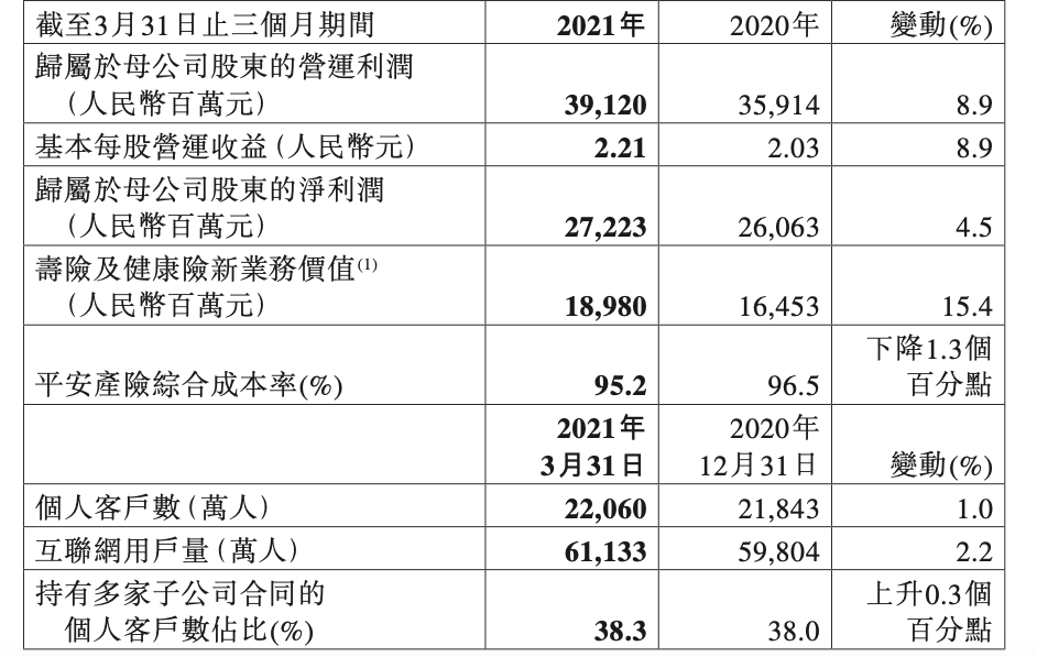 寿险业务是平安的主要利润来源,其重要性不言而喻。季报提到,2021年第一季度,平安寿险及健康险业务实现新业务价值189.80亿元,同比增长15.4%;营运利润同比稳定增长4.2%至255.80亿元。