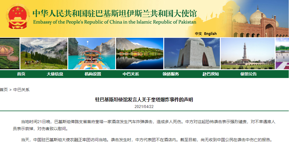 中国驻巴基斯坦大使馆网站4月22日发布“关于奎塔爆炸事件的声明”称,当地时间21日晚,巴基斯坦俾路支省首府奎塔一家酒店发生汽车炸弹袭击,造成多人死伤。中方对这起恐怖袭击表示强烈谴责,对不幸遇难人员表示哀悼,对伤者致以慰问。