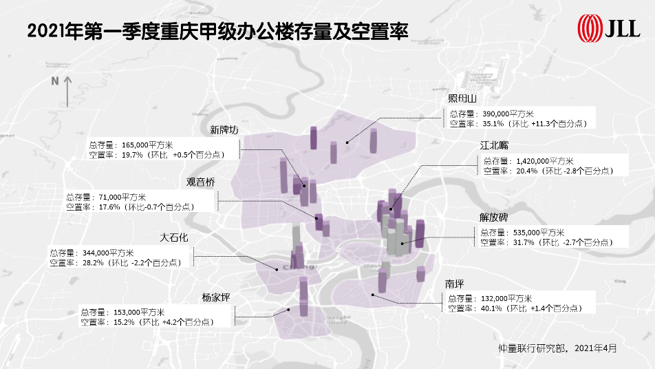 从办公楼市场的位置分布来看,一季度,城市北部照母山板块四年间首次迎来甲级办公楼供应,光环中心B座与星汇财富国际商务中心的集中交付为市场带来约7.0万平方米优质办公空间,区域总存量增至38.9万平方米。由此,重庆外资企业最集中的解放碑CBD、中国内陆地区金融产业集中度最高的江北嘴CBD、重庆科技互联网产业聚集的照母山板块,共同构筑重庆三大核心商务区。