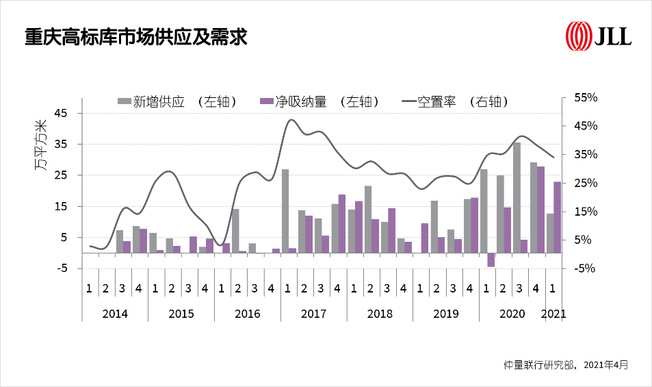 未来三年,高标库市场年平均新增供应约39万平方米,较2020年显著回落,且主要集中于空港、两江龙盛和西部物流园三大区域板块。新增供应的回落将有助于缓解招商压力,预计全市平均租金有望在2022年触底回升。仲量联行华西区产业及工业地产部负责人尤鹏伟表示,“重庆市场近期可供选择的高标库面积增加,同时租金已近低谷,租户议价能力大幅提升。对于有新租扩租以及仓储升级需求的企业而言,2021年将是获取更优租赁条件的最好时机。”