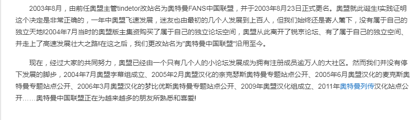 诚然,粉丝的影响力无论在哪个领域都只增不减。以“奥盟”为例,这个注册用户过万的社区在百度百科中的资料从某种角度来看与任何一家官方联盟都无甚区别。2009年,奥盟举办第一届“中国奥特曼主题日”,到2014年奥盟已经从粉丝组织过渡到官方属性,就连初代奥特曼的扮演者黑部进也曾受邀出席过粉丝线下活动。