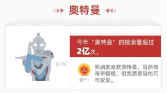 社交广场喧嚣不断,消费链上也不甘寂寞。2020年,天猫评选奥特曼为“2020年度时尚人物”;淘宝数据显示,今年以来奥特曼的平台关键词搜索高达2亿次,尤其2021年是《迪迦奥特曼》上映25周年,一款真人版的骨雕模型从400元涨到1000元,闲鱼溢价幅度超过 200%。