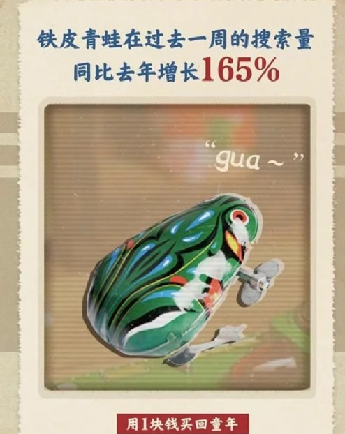 有些店铺还推出80后怀旧玩具大礼包,售价37.9,月销量600+,以铁皮青蛙为例,在去年双十二前一周的搜索量同比去年增长165%。