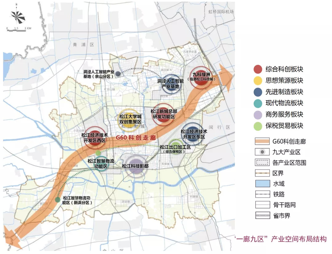松江新城“一廊九区”产业空间布局结构,图源:《松江区总体规划暨土地利用总体规划(2017-2035)》