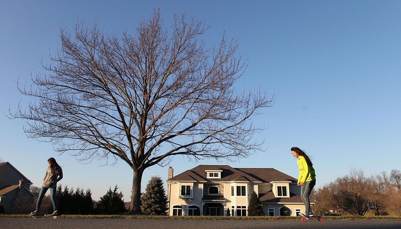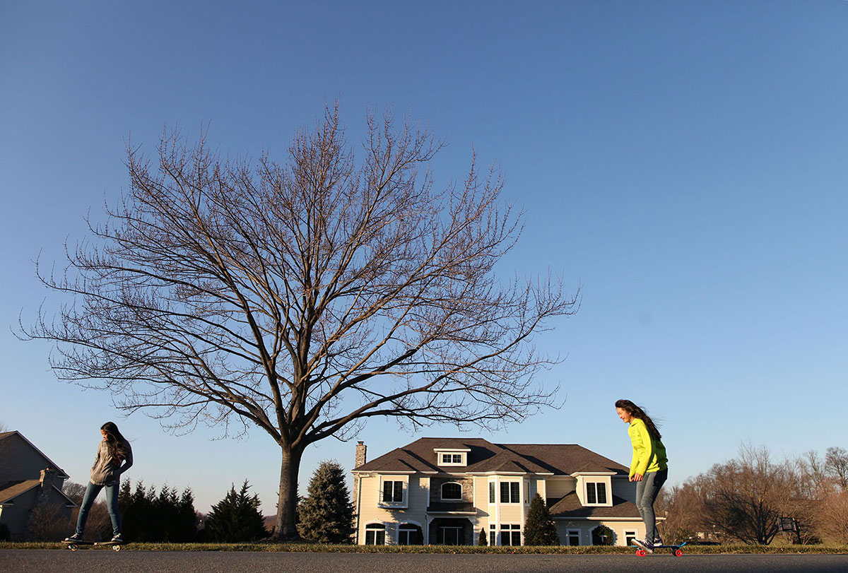 2015年1月,马里兰州,Beth Green(左)和Hope Green(右)在玩滑板。Beth于2000年被收养于湖北武汉洪湖的一家孤儿院里,当时只有16个月大。Hope于2002年在陕西汉中被收养,当时不到两岁。2015年夏天,两个女孩都回到中国,并在她们曾经生活过的孤儿院做志愿者。