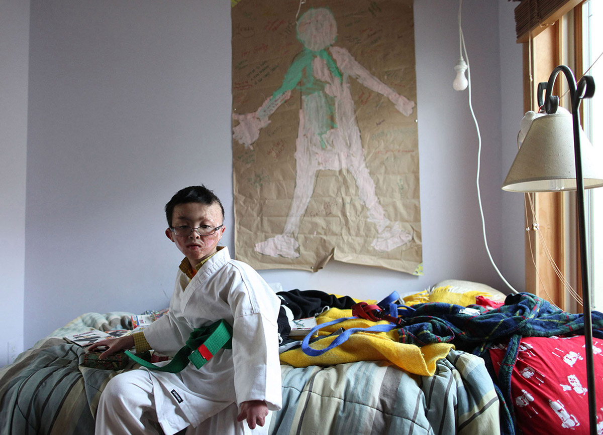 2015年3月,马里兰州,Yihan正在准备去上跆拳道课程。Yihan被收养前80%烧伤。被Calabia女士收养后,在波士顿某医院接受免费治疗,现在已经可以正常的上课、参加多种活动。