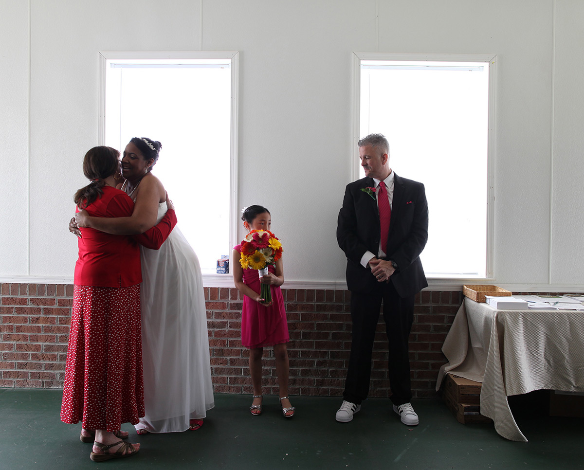 2015年4月,阿米利亚(中)与她的白人父亲和非裔母亲站在教堂门口,感谢每一个来参加他们25周年银婚纪念日的亲友们。阿米利亚的养父母婚后育有3个孩子,之后,又从中国收养两个女孩。