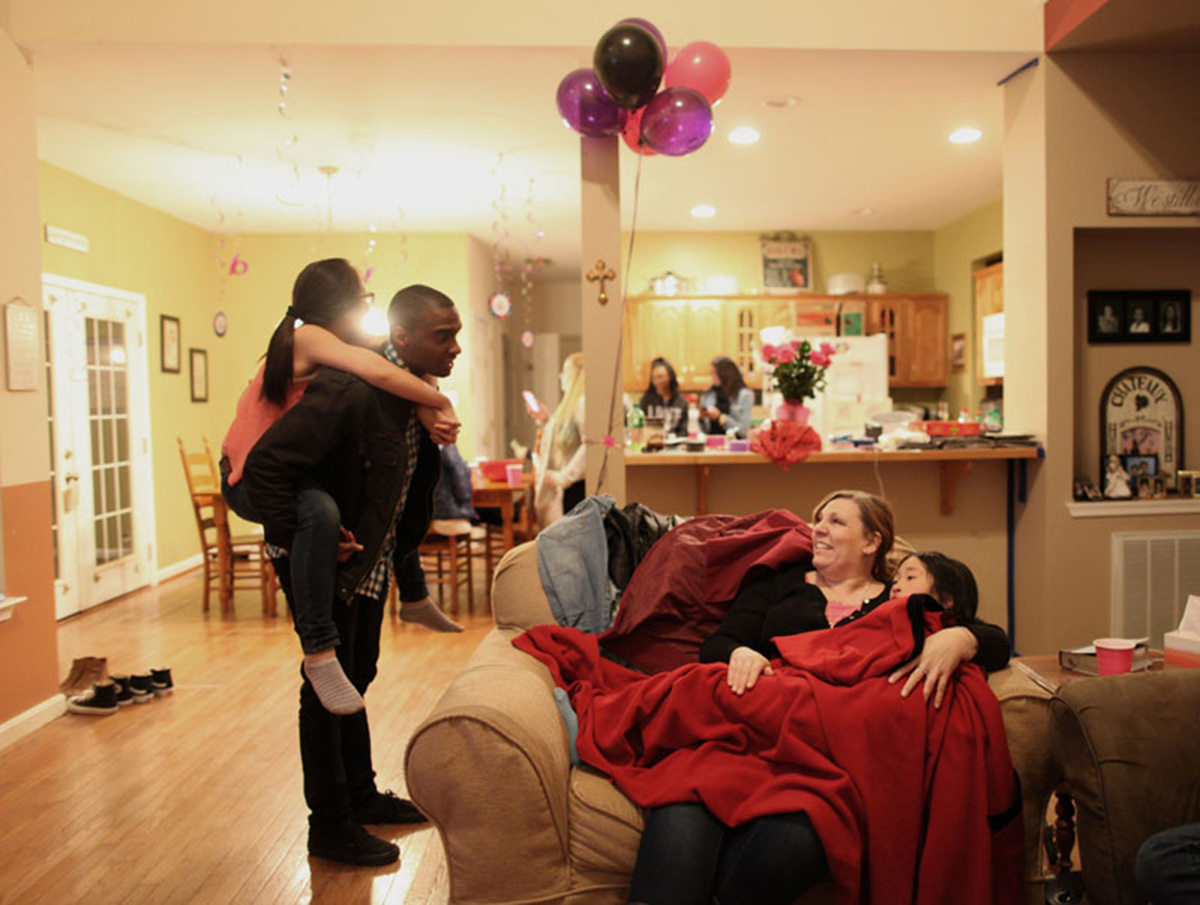 2015年3月,马里兰州,Brizzil夫妇给他们的大女儿办16岁的生日聚会,亲友们抱着他们的两个中国收养来的养女聊天。