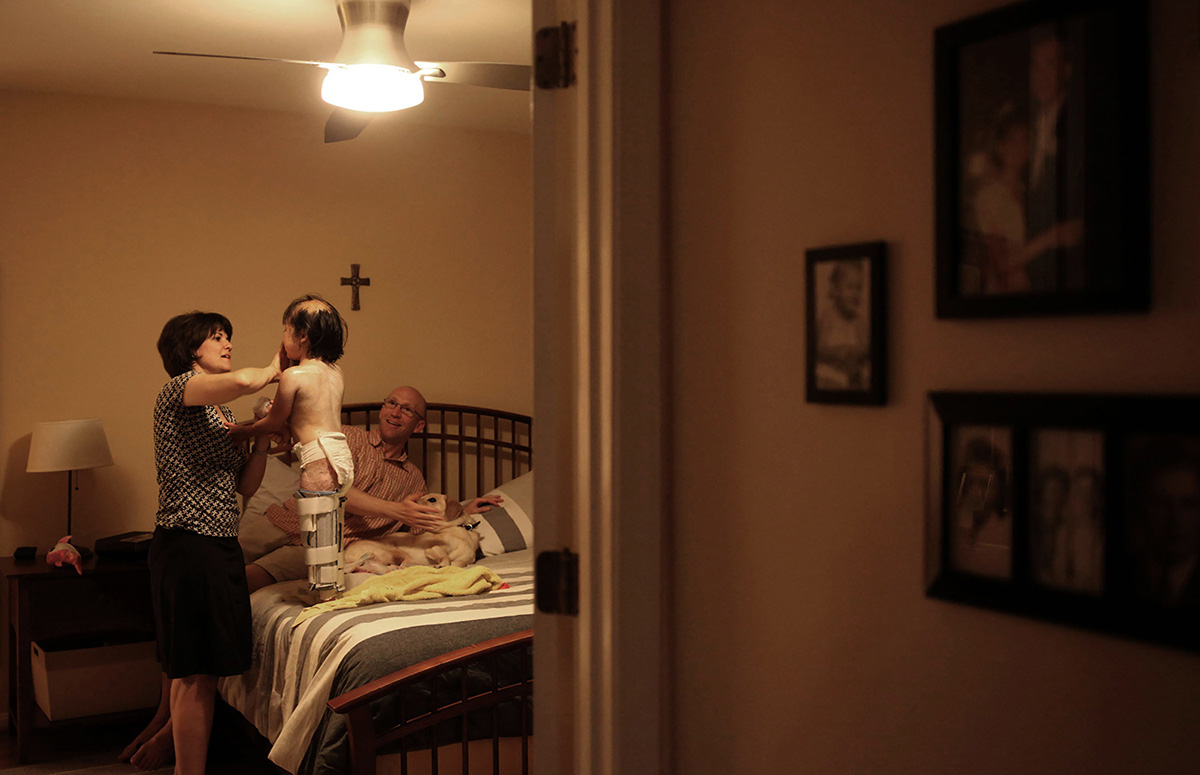 2015年7月,佛吉尼亚州,Sarah的美国父母每晚睡前都坚持为她清理伤口。妈妈Teresa Bosch说,目前最困难的是让Sarah入睡,因为伤口又疼又痒。Sarah Bosch(邓悦悦)生于2010年6月,2012年3月被遗弃在杭州市儿童福利院门口,当时她的全身烧伤面积超过70%。2012年6月,Sarah被收养。 “她特别信任我们,温和、平静,似乎能明白,我们是她的生命的转折点”,妈妈Teresa回忆到当时在杭州福利院见到她时。
