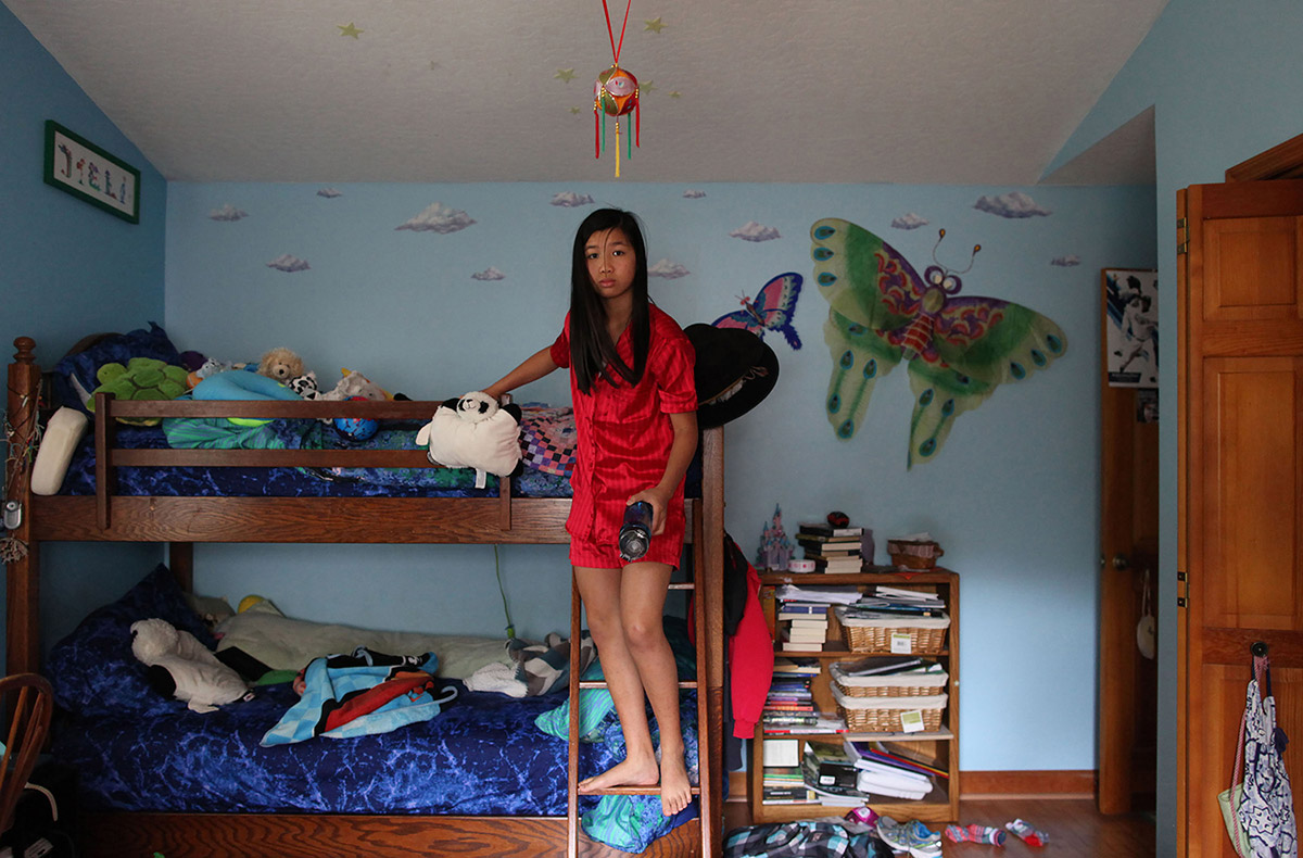 2014年12月,佛罗里达州,13岁的洁丽·安娜·维格里夫在自己的房间里。她的房间装饰着包含有很多中国或亚洲元素的饰品,美国妈妈至今保留着她的中文名字“洁丽”(Jieli音)。Jieli 11个月时,被Wegerif夫妇收养于江苏省。当时,Wegerif已经有3个亲生孩子,收养 Jieli之后,又从中国收养了3个孩子。
