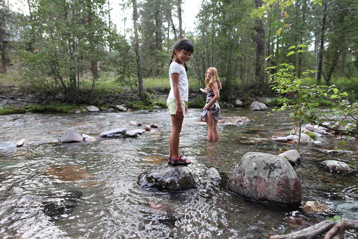 2015年7月,晚餐后她和姐姐Kine在家周围的树林里玩。Anaka(党芳婷)(左)生于2006年5月25日,2007年7月,在广东省阳江市阳东区福利院被收养。此后Anaka一直生活在美国蒙大拿州。