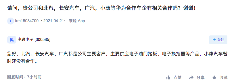 奥联电子22日在互动平台上表示,北汽、长安汽车、广汽都是公司主要客户,主要供应电子油门踏板、电子换挡器等产品,小康汽车暂时还没有合作。
