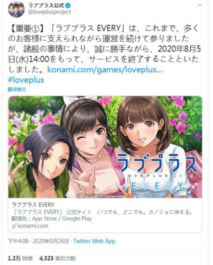 但是,可惜科乐美《爱相随Every》手游上架不到一年,就在2020年8月的时候停止运营了。