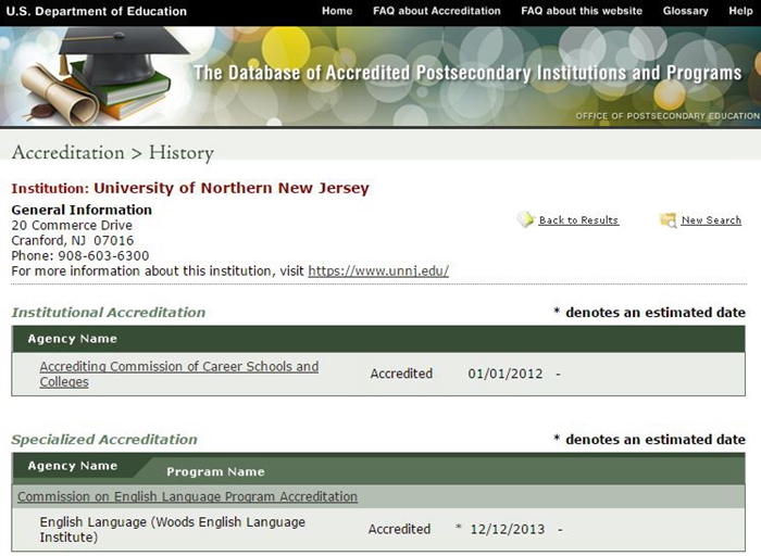 如果你觉得以前从没听过这个学校,担心是没有资质的冒牌大学,可以上美国教育部的官网进行查询。查询的结果是这个学校在2012年获得了教育部颁发的资质,2013年获得开办英语培训课程的资质。