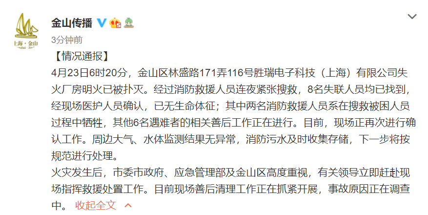 据@金山传播 微博消息,4月23日6时20分,金山区林盛路171弄116号胜瑞电子科技(上海)有限公司失火厂房明火已被扑灭。经过消防救援人员连夜紧张搜救,8名失联人员均已找到,经现场医护人员确认,已无生命体征;其中两名消防救援人员系在搜救被困人员过程中牺牲,其他6名遇难者的相关善后工作正在进行。目前,现场正再次进行确认工作。周边大气、水体监测结果无异常,消防污水及时收集存储,下一步将按规范进行处理。
