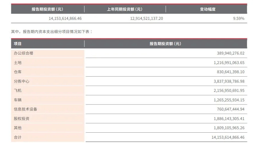 顺丰2020年财务报告显示,截至报告期内,顺丰一共投资了141.55亿元,占收入比重约9.2%,比去年多了近12亿,包括土地、仓库、分拣中心、飞机、车辆、信息技术设备等,其中分拣中心和飞机投资金额较大,占了近60亿。此外,在科技方面的投入达到42.73亿元,同比提升16%。