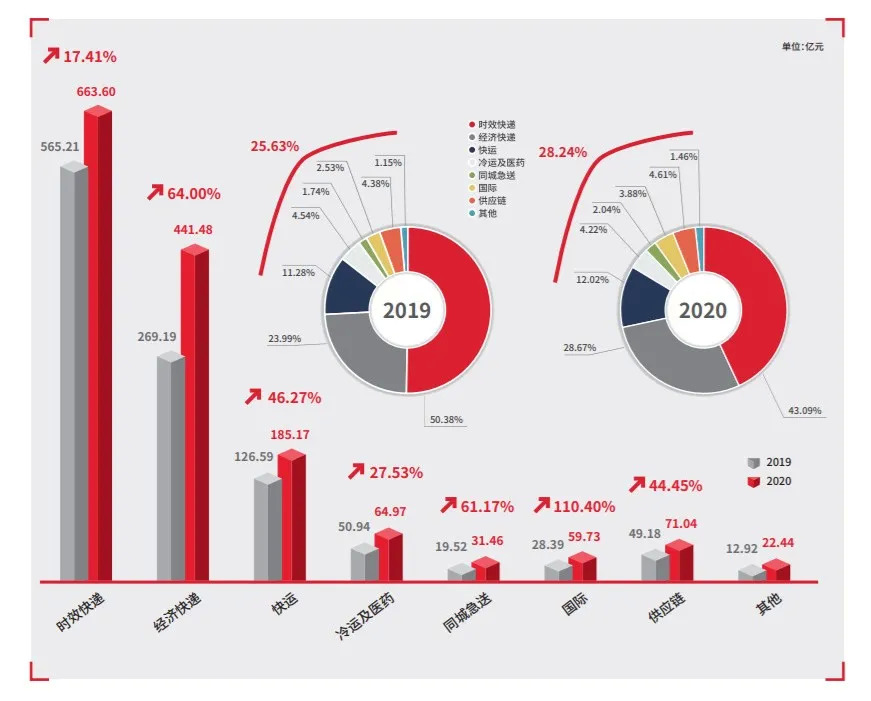 从2020年,顺丰各个业务营收占比情况来看,时效、经济、快运、冷运及医药、同城急送、国际、供应链,比例分别为43%、28.6%、12%、4.2%、2%、3.9%、4.6%、1.46%。与2019年相比,营收占比明显出现了时效下滑、经济和快运上升的情况。其中,时效快递下滑超过7%,经济快递增长了近5%。