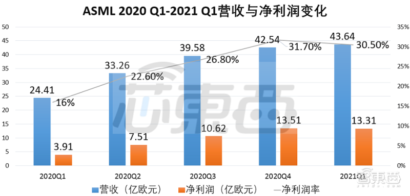 芯东西4月22日报道,昨天,ASML发布了2021年第一季度的财报。其第一季度营收为44亿欧元(约合343.74亿人民币),同比增长78.8%,环比增长2.6%;净利润为13亿欧元(约合101.56亿人民币),同比涨幅高达240.4%,环比下滑1.5%,净利润率为30.5%。