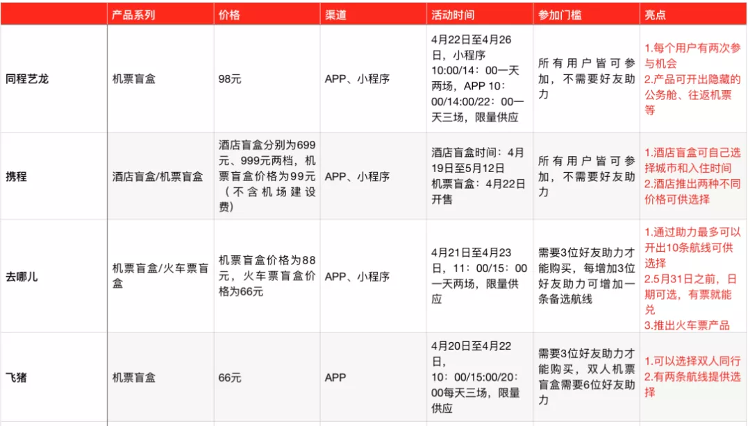 4月19日,携程推出售价分别为699元、999元的酒店盲盒,还预告22日将上线价格为99元(不包含机场建设费)的机票盲盒;4月20日,飞猪推出66元机票盲盒,参与活动的消费者,在得到好友助力后可以66元的超低价,获得一个飞往全国随机任意目的地机票盲盒。4月21日,去哪儿网同时上线88元的机票盲盒和66元的火车票盲盒……