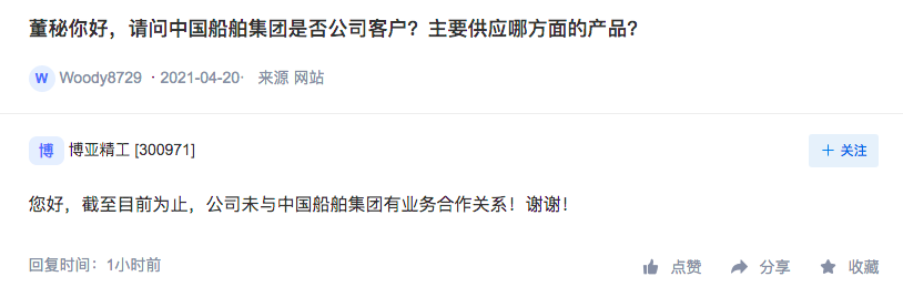 博亚精工:公司未与中国船舶集团有业务合作关系