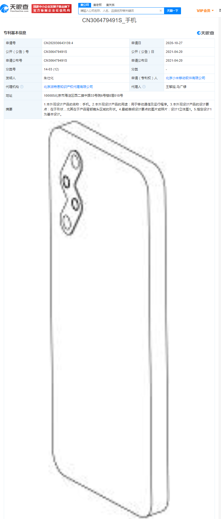 据天眼查APP显示,近日,北京小米移动软件有限公司获得一项手机外观专利授权,公告号CN306479491S,申请日期为2020年10月。