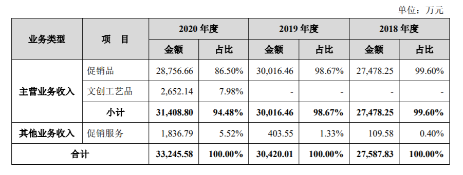 招股书显示,卡恩文化主营业务为销售促销品和2020年新增的文创工艺品,其他业务为促销服务。