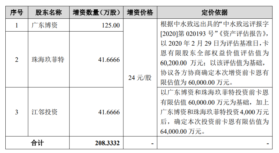 上市前夕(2020年6月11日),广东博资同泽一号股权投资合伙企业(有限合伙)(简称“广东博资”)、 珠海玖菲特玖祥股权投资基金合伙企业(有限合伙)(简称“珠海玖菲特”)及北京江邻投资管理有限公司(简称“江邻投资”)三家外部投资者突击入股,卡恩文化的注册资本由2500万元增加至2708.3332万元,具体增资情况如下图: