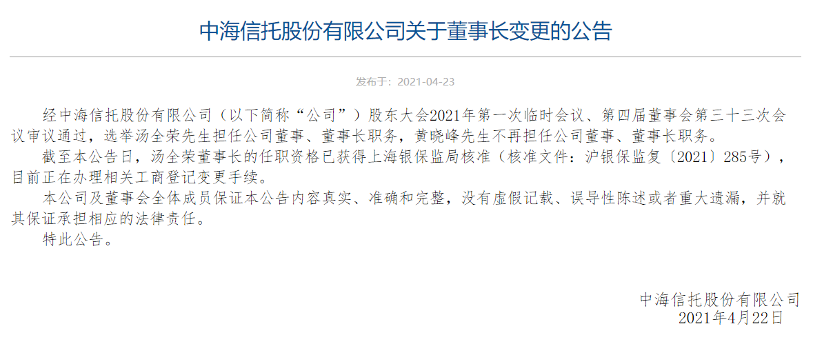 4月23日,中海信托在官网发布《中海信托股份有限公司关于董事长变更的公告》称,公司股东大会2021年第一次临时会议、第四届董事会第三十三次会议审议通过,选举汤全荣担任公司董事、董事长职务,黄晓峰不再担任公司董事、董事长职务。中海信托称,截至本公告日,汤全荣的任职资格已获得上海银保监局核准,目前正在办理相关工商登记变更手续。