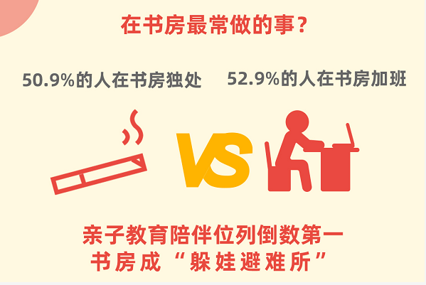 阅读,其实并不是用户首要的考虑因素。调查显示,人们设立书房的原因,是认为在书房里可以更加高效地工作和学习,拥有安静独立的空间。也有一部分人认为设置书房可以提升家庭品味格调,显得家里更有文化气息、有面子。一半的有书房者认为,书房可以提供暂时逃离现实的空间。此外,书房还成为了“躲娃避难所”,问卷中,“除了阅读外,平时主要在书房干什么”的回答中,在书房里陪孩子阅读、玩耍位列倒数第一。