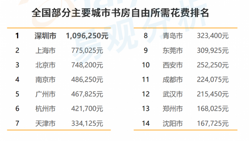 报告调研了各地书房的花费成本,显示全国实现“书房自由”的平均成本为29万元。而在具体城市方面,深圳、上海、北京的书房成本位列前三甲,分别高达近110万元、78万元、75万元。在有书房的家庭中,6成以上的房屋面积都在120平米以上,从户型上来看,有书房的家庭住房都是3居室及以上的户型(注:报告中对书房的定义指的是家庭住房中被称作书房的独立房间或空间,不包括客厅、卧室等房间设置的阅读角等)。