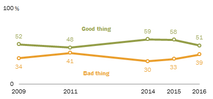 皮尤统计发现,美国人对于自由贸易协定的积极看法近年来有所消减:目前有51%的人认为,与其他国家之间的此类贸易协定对美国而言是好事;而39%的人认为是坏事。赞成自由贸易协定的人数比例在2014年达到顶峰(59%),目前的支持水平与2011年3月接近。皮尤还发现,非洲裔和西班牙裔明显支持此类协议。