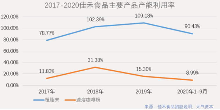根据招股说明书,公司2018年的植脂末国内市场占有率为14.33%,相较于2016、2017年的市占率17.44%和15.22%略有下滑。然而,截至2020年9月,佳禾订单总量达10.34万吨,已经超过现有产能,境内订单同比增长达13.96%,市占率下降或许可以部分归因于市场供不应求,佳禾不足14万吨/年的产能已见顶,公司也因此在此次募资用途中规划了年产12万吨的植脂末产能提升项目。