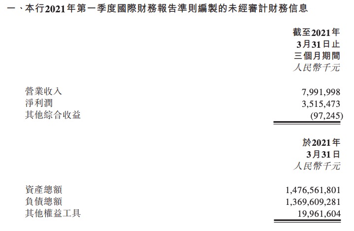 4月23日,渤海银行(09668.HK)披露了2021年第一季度未经审核财务数据。