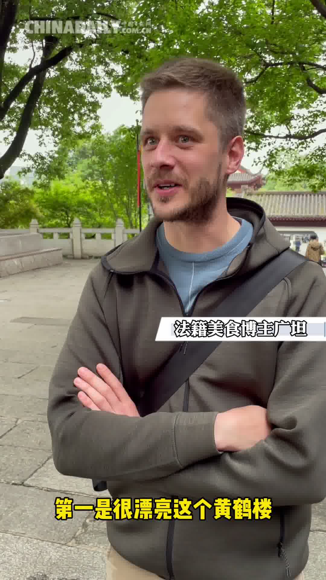 一下高铁,媒体团采访的第一站就来到雄踞长江之滨、蛇山之上的黄鹤楼。在这里,我们遇到了三个人:带着82岁高龄母亲特地来看黄鹤楼的张女士,想尝尝正宗热干面的法籍美食博主戴广坦,和向世界推介武汉的黄鹤楼工作人员。对他们的采访时间不长,但寥寥几句对话,就已经道出他们与武汉的感情。