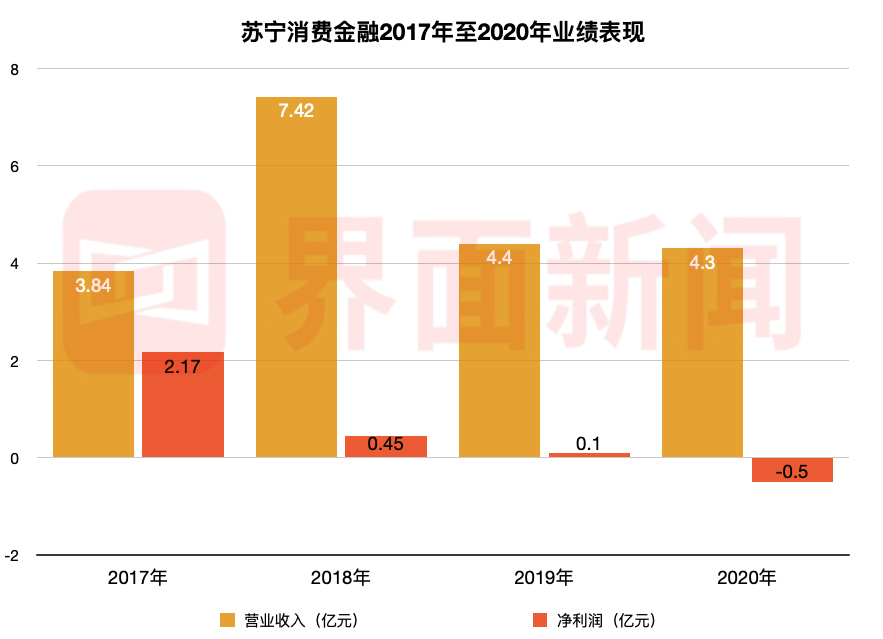 经过2015、2016年连续两年亏损之后,2017年,苏宁消费金融首度扭亏为盈,营收为3.84亿元,净利润2.17亿元;2018年,其营收为7.42亿元,同比增长近2倍,但净利润大幅下滑79.2%至0.45亿元;2019年,其营收和净利润双双下滑,营业收入同比下降40.7%至4.4亿元,净利润下跌近八成至0.10亿元;2020年甚至由盈转亏,营收则同比下降2.27%。