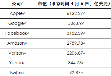 按4月6日的市值计算,这些对手的市值总和是Twitter的200多倍。即使不算主动退出的Facebook和NFL接触的谷歌、苹果两家公司,Verizon、雅虎和亚马逊的市值也是Twitter的57倍,其中与Twitter市值最接近的Yahoo,市值也有前者的3倍多。