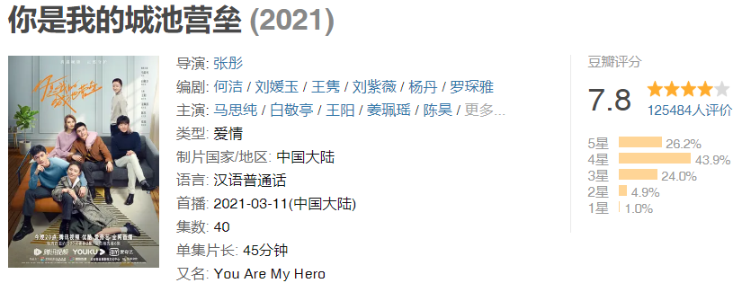 值得一提的是,《司藤》和《你是我的城池营垒》不仅仅是网剧有效播放榜的冠亚军,即便放在整个剧集市场,也同样是热播榜前二,秒杀众多台播剧。而且两部剧豆瓣评分分别为7.5和7.8,好评度爆棚,评分人数也都突破了10万+。