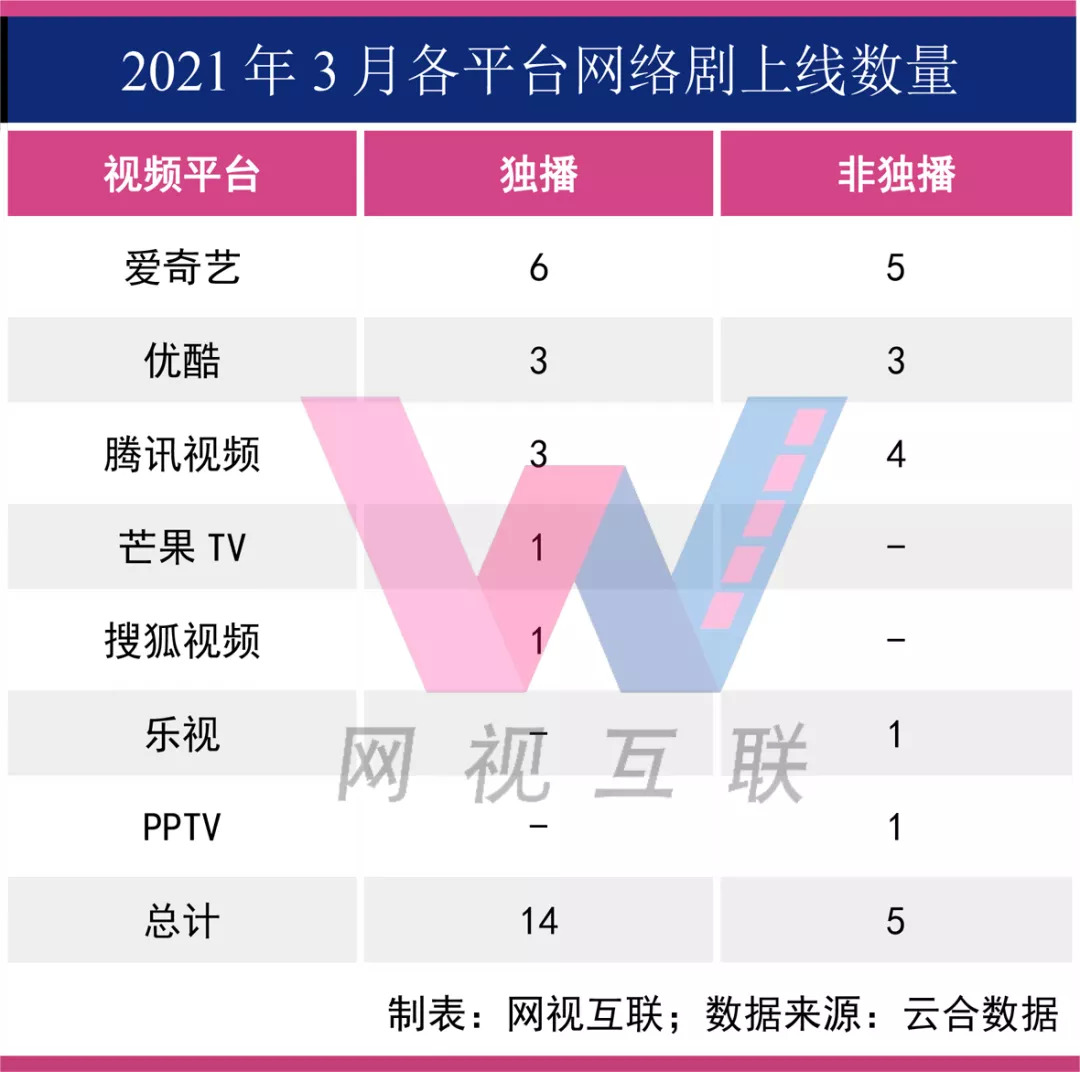 据云合数据,在剔除电视剧及20分钟以下的短剧之后,3月份全网上线的网络剧共19部,其中独播剧14部,非独播剧5部。