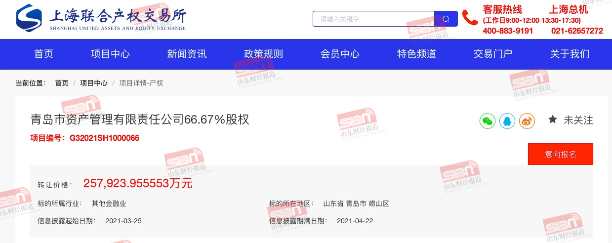上海联交所信息显示,青岛资管股权转让项目的信息披露起始日期为今年3月25日。4月22日,该项目信息披露期满。山东财经报道观察到,4月23日,挂牌期满后,青岛资管66.67%股权转让项目已在上海联交所下线。