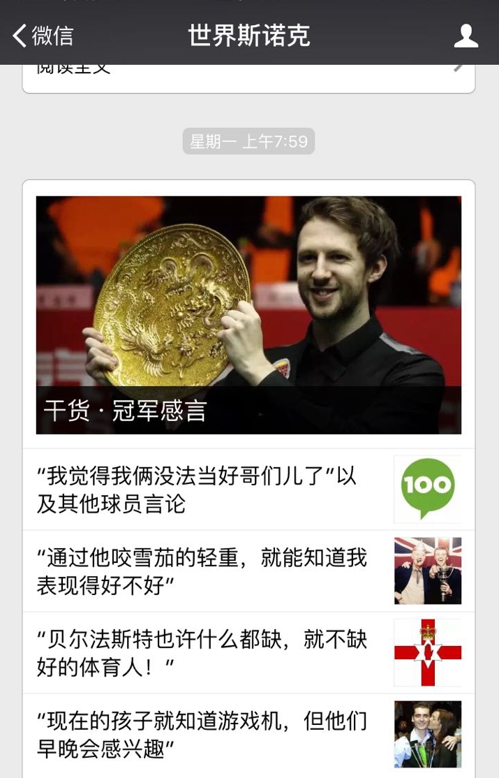 三年前,世界斯诺克还没有开始执行社媒战略。而三年后,他们已经在脸书、YouTube、Instagram创建了庞大的粉丝群体。在中国,国际台联会面临完全不同的挑战。所以,他们在中国寻找了一个合作伙伴,帮助他们在微博、微信、优酷等平台上谋求发展。